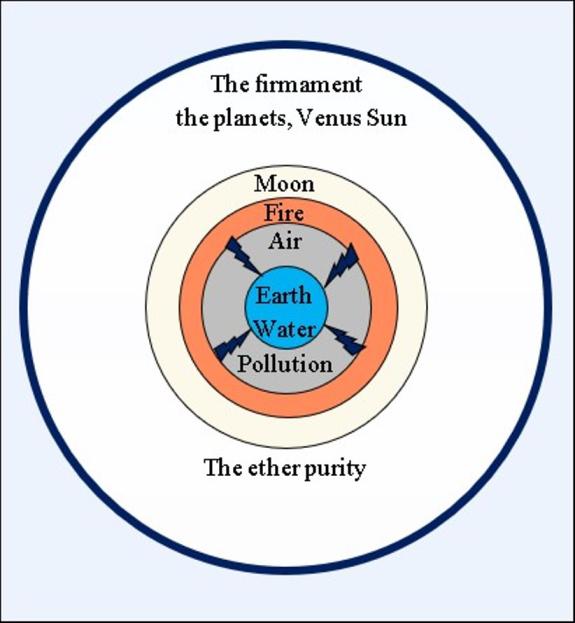 Beyond, the world is perfect and made up of ether, the fifth element, the